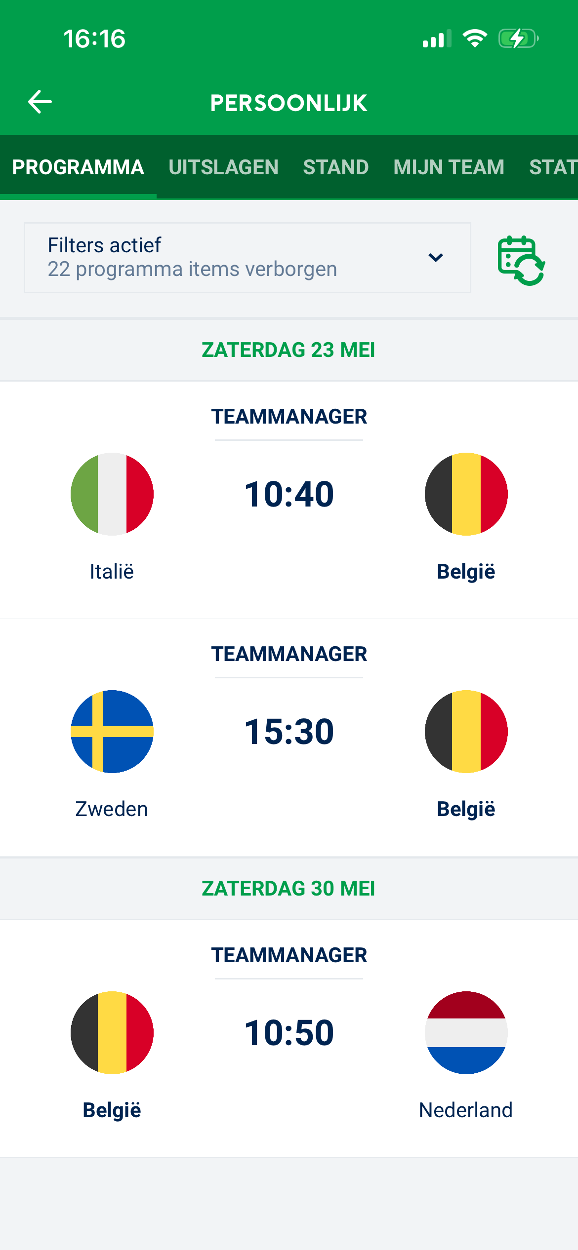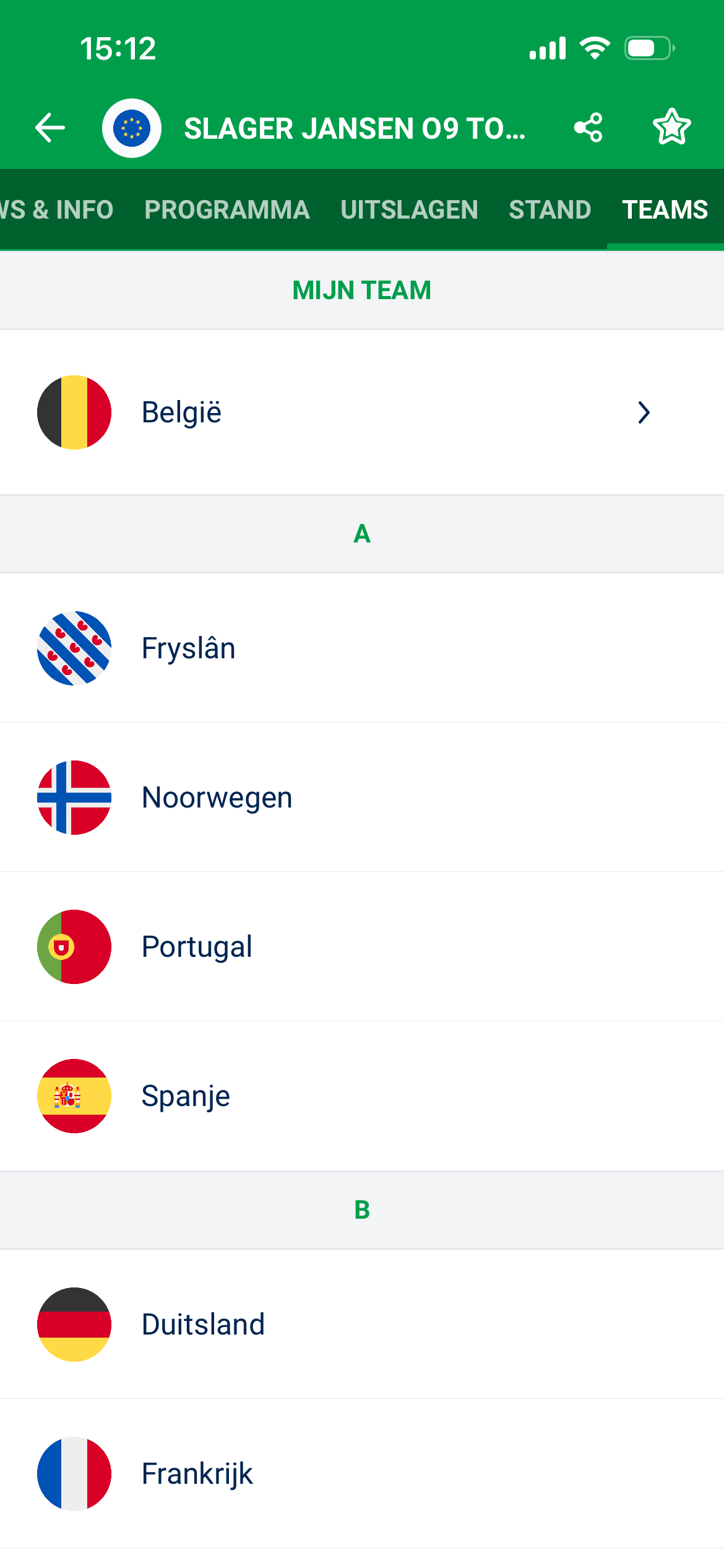 Ga in de app naar het toernooi en open het tabblad Teams. Bovenaan de lijst staat jouw team (in het afbeelding is dat België). Zodra je op het team klikt, opent de Teamopgaaf. Hier kun je spelers toevoegen of verwijderen.