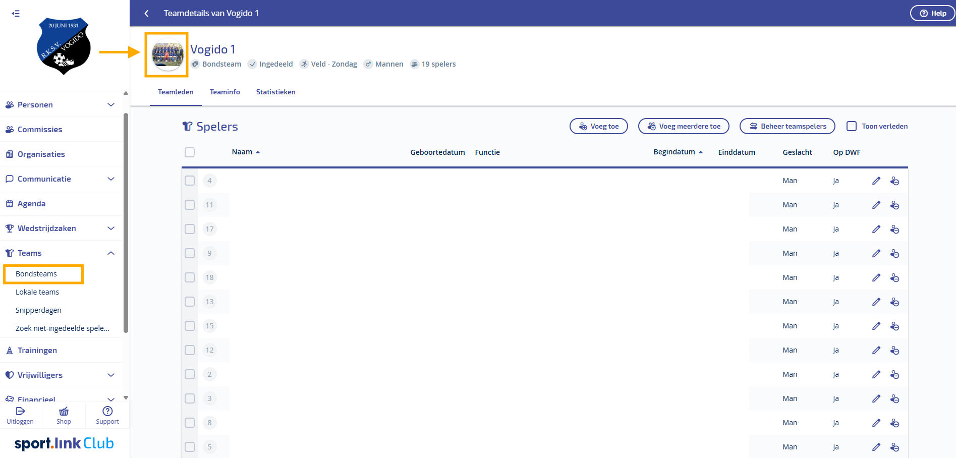 Ga in het menu links naar Teams en kies voor Bondsteams of Lokale teams. Selecteer in de lijst het team waarvoor je een foto wilt toevoegen (zie foto).