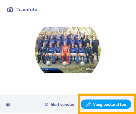 Klik op het pictogram om het uploadscherm te openen. Kies vervolgens een foto vanaf je computer of apparaat en klik op Opslaan. De teamfoto wordt direct toegevoegd en zichtbaar in de teamheader (zie foto).