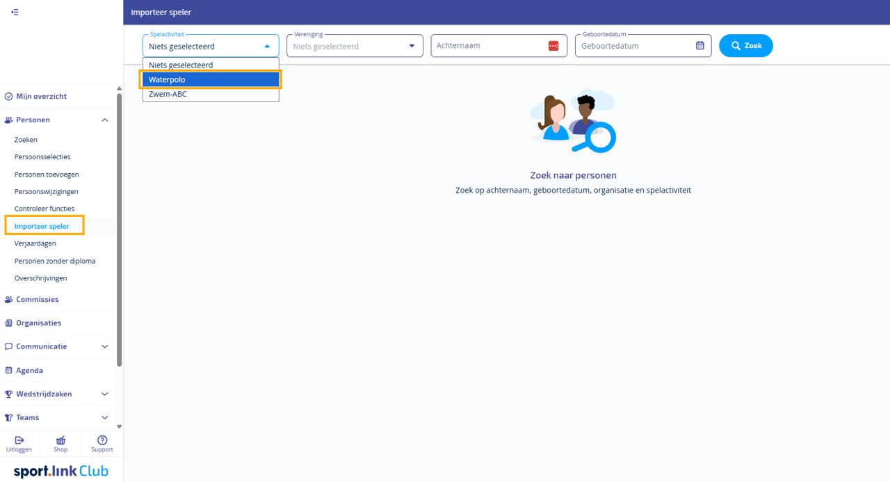 Eenmaal ingelogd in de startgemeenschap ga je naar Personen - Importeer speler