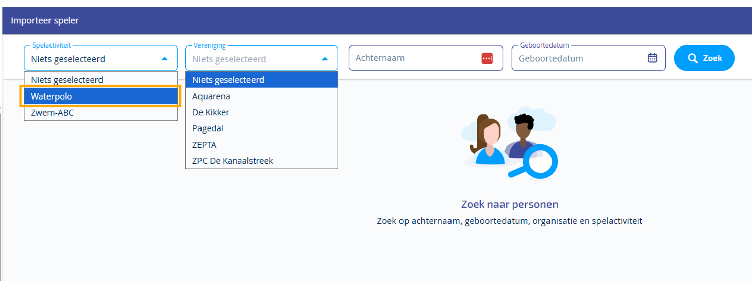 Kies de spelactiviteit waarvoor je spelers wilt toevoegen en vervolgens kies je bij vereniging de vereniging van waaruit je een speler wilt toevoegen. Zie onderstaande afbeelding.