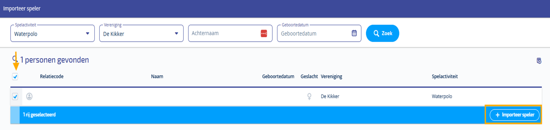 Als je de vereniging hebt geselecteerd kun je al zoeken en het systeem zal een lijst met mogelijke spelers tonen. Eventueel kun je ook nog gespecificeerd zoeken op achternaam en geboortedatum. Selecteer de speler of spelers door de regel aan te vinken. In de blauwe balk verschijnt een button "Importeer speler". Nadat je deze kiest worden de geselecteerde spelers geïmporteerd en ben je klaar.