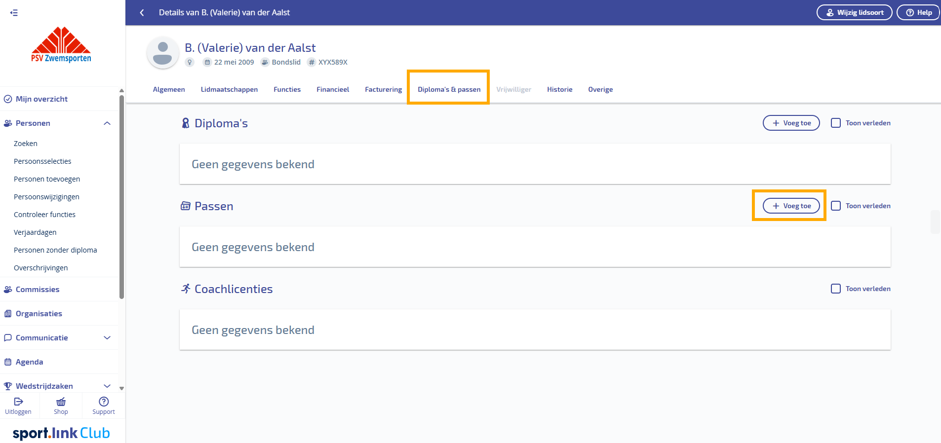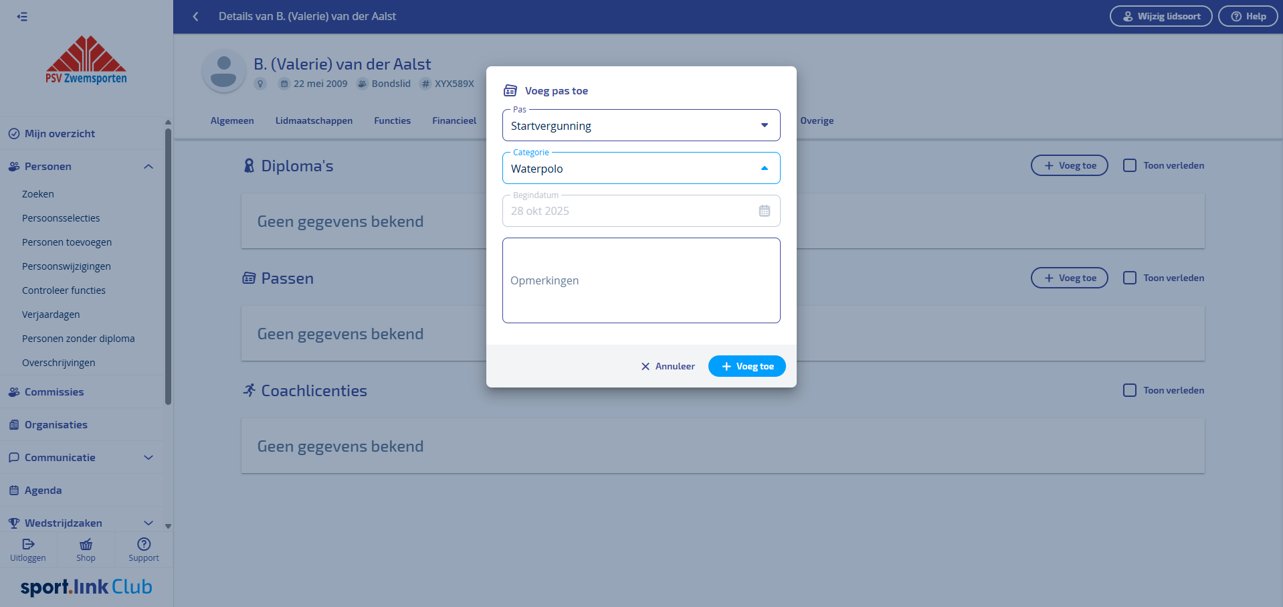 Een startvergunning voeg je toe op de ledenkaart van het lid zelf. Nadat je de ledenkaart (via personen-zoeken) hebt geopend ga je naar het tabblad Diploma's & Passen. Bij het onderdeel Passen kun je nu een startvergunning toevoegen. Zie onderstaande afbeelding.